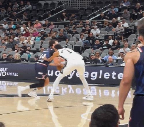 管子煜進攻前搖,運球突破都做得挺不錯,可惜馬刺最后一道屏障——文班亞馬,實在是太變態(tài)了,直接一掌大帽拒之門外。