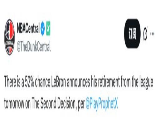 北京時間10月7日,勒布朗-詹姆斯突然更新社媒寫道:“所有決定中的決定,10月7日,美東中午12點(北京時間10月8日凌晨0點)”。對此,美國頂級體育預測市場ProphetX認為,詹姆斯明天宣布退役消息的概率為52%。知名美媒CBS分析了詹姆斯的這一預告,質疑湖人超巨多次借“退役”炒作,真正決定時恐怕沒人相信了。以下是CBS的解析——
