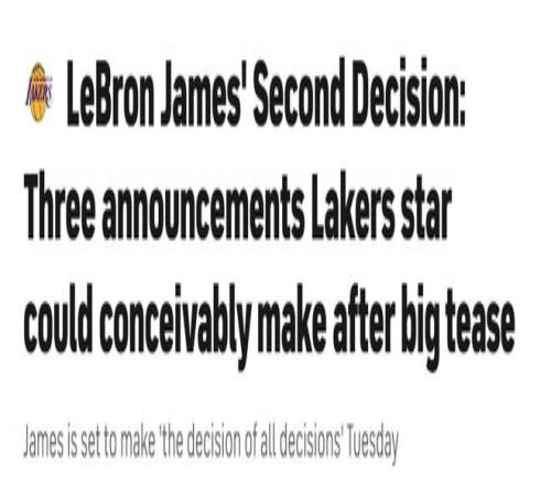 2010年有《決定》電視節(jié)目;2014年決定重返騎士時,他通過《體育畫報》的特刊封面宣布,上面醒目地印著“我回家了”,還撰寫了公開信解釋為何在邁阿密奪冠后仍要回歸;2018年決定加盟湖人時雖不那么張揚,但也效仿邁克爾-喬丹,通過經紀公司發(fā)布新聞稿宣布回歸。