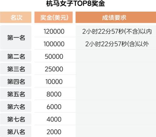 作為金標賽事,北京和杭馬或?qū)型饧x手出戰(zhàn),也增加了國內(nèi)選手想拿走冠軍的難度。北馬的冠軍獎金為8萬美元,杭州馬拉松的冠軍獎金更是達到12萬美元。當然,高額獎金要有不低的達標成績。但即使不達標,北馬和杭馬的冠軍獎金也分別有5萬和10萬美元。